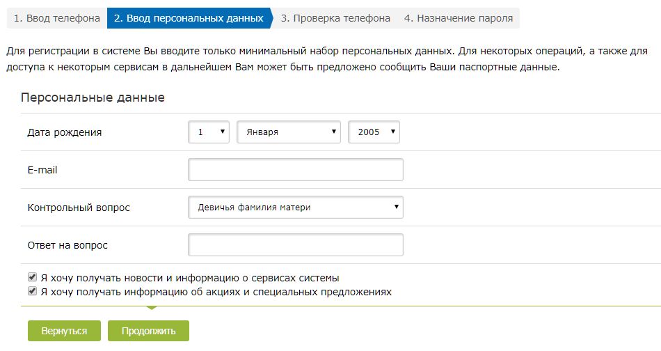 Вторым шагом от Вас потребуется указать минимальный набор своих персональных данных. Потребуется заполнить дату рождения, e-mail, выбрать контрольный вопрос и задать на него ответ, а также отметить или снять галочки связанные с получением новостей и информации об акциях от системы.