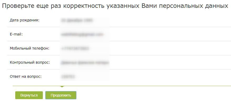 Проверьте корректность данных и нажмите на кнопку «Продолжить».