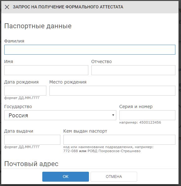 Введите данные для запроса аттестата в появившемся окошке.