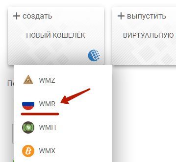 Давайте разберемся на конкретном примере и создадим себе первый WMR кошелек. Для этого нажмите на кнопку Создать новый кошелек и выберете нужный из выпадающего списка.