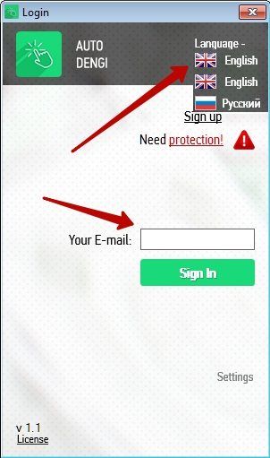 Теперь нам останется только ввести e-mail использованный нами при регистрации в соответствующее поле и сменить язык на русский.