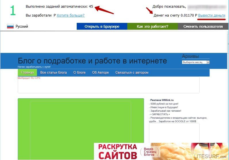 На картинке выше видно окно с происходящим в программе. Также развернув её мы увидим количество выполненных автоматических заданий и наш текущий баланс.