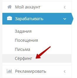 После простой и быстрой регистрации заходим в свой профиль и смотрим на левое меню. Разворачиваем вкладку «Зарабатывать» и переходим по ссылке в раздел «Серфинг».
