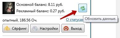 В основном окне есть несколько кнопок. Особенно интересная из них называется «Обновить данные», кликнув по которой Вы получите актуальную информацию о Вашем аккаунте и доступном серфинге.