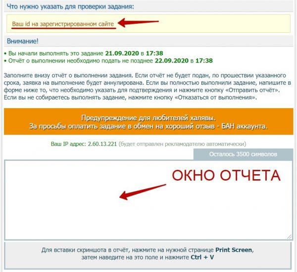 После нажатия деньги за выполнение попадут в резерв. Как только закончите останется помесить в появившееся на странице задания окно отчета, то что просил указать рекламодатель. В данном случае ID.