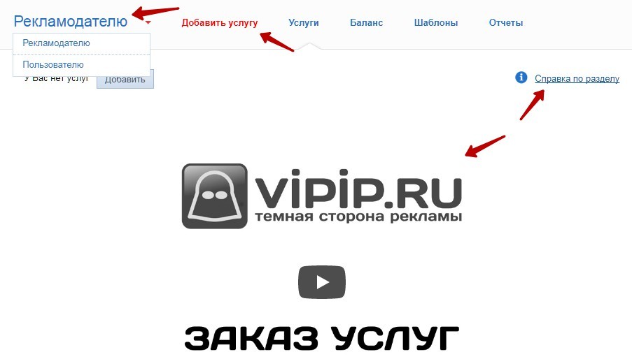 Если Вы планируете работать как рекламодатель, то нужно перейти в соответствующий раздел и изучить имеющиеся услуги. В кабинете рекламодателя также есть «Справка по разделу» и обучающее видео.