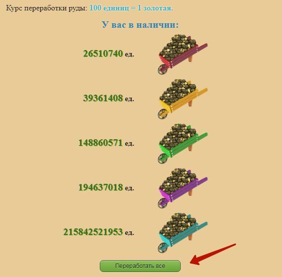 После появления первого работника Вы сможете переходить в раздел «Склад руды» и периодически собирать накопленную руду.