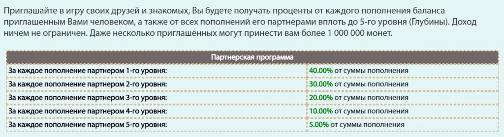 Из важных вещей стоит отметить также и местную привлекательную партнерку. За каждое пополнение партнером Вы будете получать 40%-30%-20%-10%-5% от суммы пополнения и в зависимости от уровня.