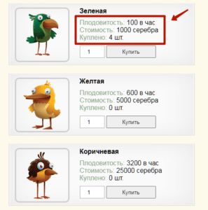 В игре присутствует пять видов птиц разных цветов и с разной плодовитостью. Все они приносят яйца, которые можно продавать и получать за это серебро.
