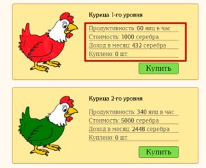Можно покупать любое количество этих замечательных птиц, которые навечно будут Вашими. Конечно же курицы будут нестись, а соответственно будут появляться яйца, которые можно в любой момент продать и обменять на реальные деньги.