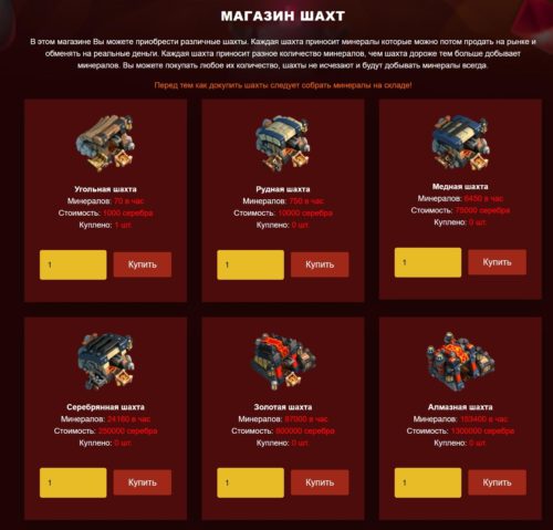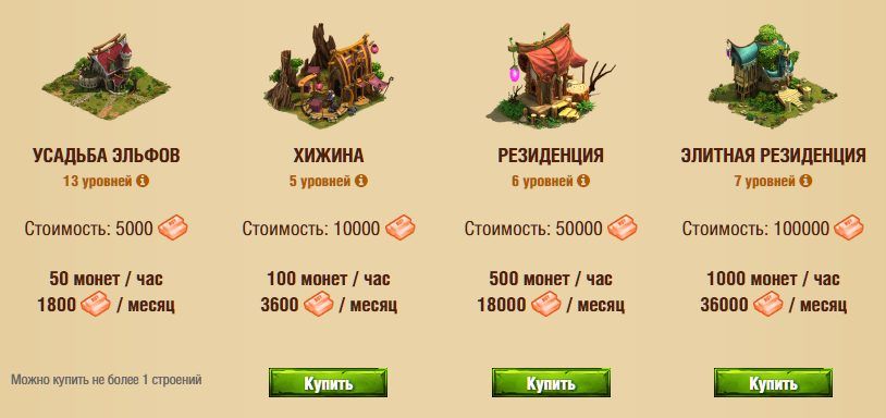 Всего доступно 11 построек с возможностью повышения уровня каждой в отдельности (улучшение увеличивает доходность постройки). Купить их можно в разделе «Магазин», там же есть их стоимость и важная дополнительная информация.