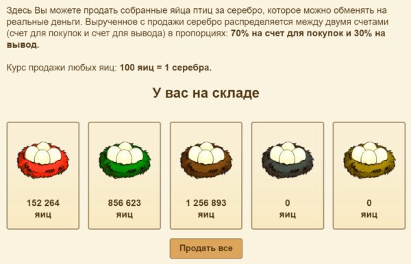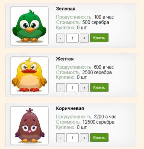 На проекте присутствует возможность получить птиц бесплатно, ежедневный бонус, игровая зона, еженедельная лотерея, биржа серебра, накопительный банк и еще множество интересных вещей для развития.