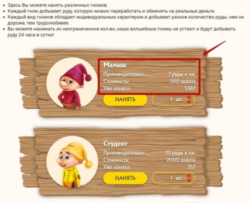 Суть игры заключается в найме гномов, которые будут добывать для Вас руду. Гномы есть разные: «Малыш», «Студент», «Спец», «Бывалый» и «Профи» — всего пять видов. Каждый имеет разную стоимость и производительность. Если в своем аккаунте открыть список нанятых гномов — «Логово наемников», то можно увидеть их характеристики и количество уже имеющихся у Вас.