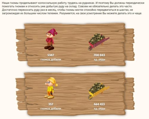 После найма гномы сразу же начинают добывать руду, которую нужно периодически относить на склад через раздел «Рудники». Периодичность Вы выбираете сами — можете относить хоть по несколько раз за день, хоть раз в неделю.