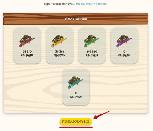 Как только отнесете руду на склад можно перейти в раздел «Переработка руды» и быстро переработать её в золото по курсу 100 единиц руды = 1 золотая монета.