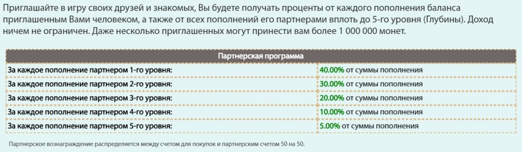 Таким образом Вы получите гораздо больше средств на развитие при меньших усилиях! - Участвуете в партнерской программе — приглашаете в игру новых пользователей и получаете за это вознаграждение в 10-40% от их пополнений (в зависимости от условий игровой партнерки).