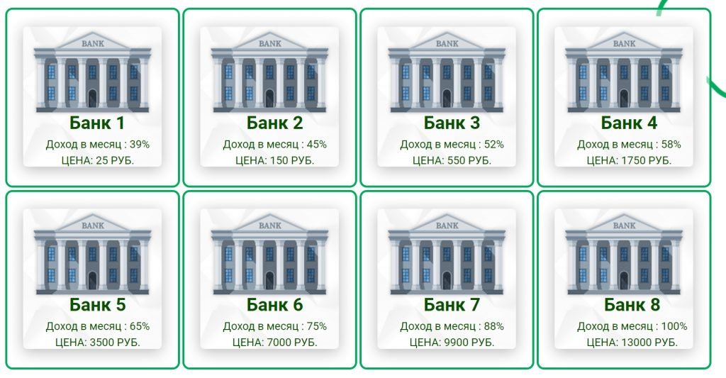 Есть 8 типов банков, которые отличаются ценой и доходностью (эти вещи здесь напрямую связаны между собой).