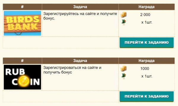 Бесплатные птицы даются за выполнение простых поручений: за быстрые регистрации на сторонних ресурсах, вступление в группу ВКонтакте и даже за первое пополнение баланса (такое задание тоже есть).