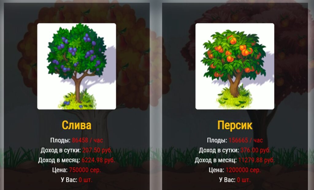 В разделе «Купить дерево» доступно 6 видов деревьев (яблоня, вишня, лимон, груша, слива, персик) по разной стоимости. Каждое из них приносит от 4.75 до 11279.88 рублей за свои плоды в месяц (в игре сразу рассчитан.