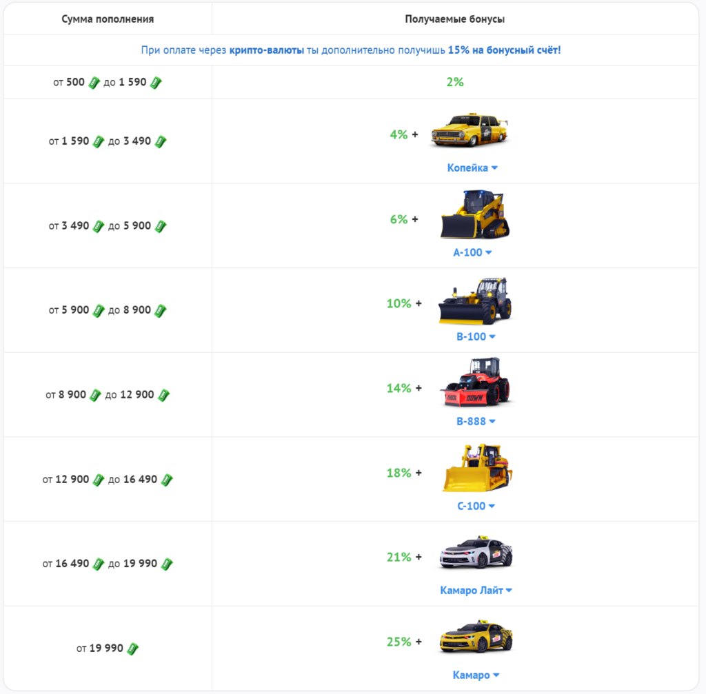 Самая дешевая машинка стоит всего 199 рублей и приносит около 23% в месяц от своей стоимости (на самом деле цифра занижена и при желании играя активно можно получать гораздо больше заявленного).
