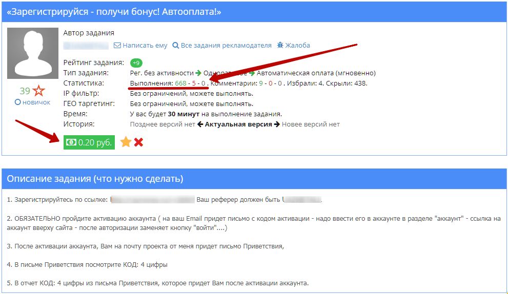 Размещения задания — можно разместить одно или несколько заданий на сайтах из предыдущего пункта. По сути все просто — Вы создаете задание в категории «Регистрация без активности» или «Регистрация с активностью» в зависимости от того, что требуется от исполнителей. Настраиваете его по своему усмотрению и выставляете цену, которую готовы заплатить за регистрацию по Вашей реферальной ссылке.