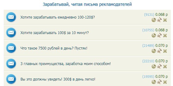 Если перейти в него, то можно увидеть весь список доступной почты для просмотра. Там же можно сразу увидеть название писем, время просмотра и оплату, которую получим.