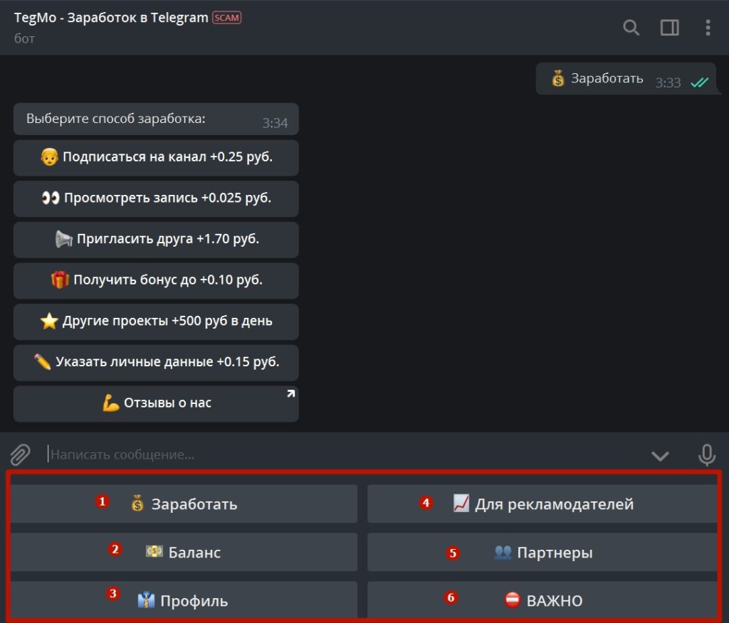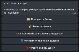 - «Заработать» — самое интересное конечно здесь. Нажав на эту кнопку мы откроем все доступные способы заработка через бот: