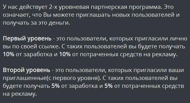 - «Партнеры» — в боте действует двухуровневая партнерская программа по которой можно за привлечение рефералов получать 10% от заработка и потраченных средств с 1 уровня и 5% со второго.