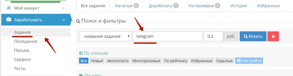 Затем используя блок «Поиск и фильтры» сверху найдите задания по названию «telegram» или «телеграм» (обязательно пробуйте оба варианта).